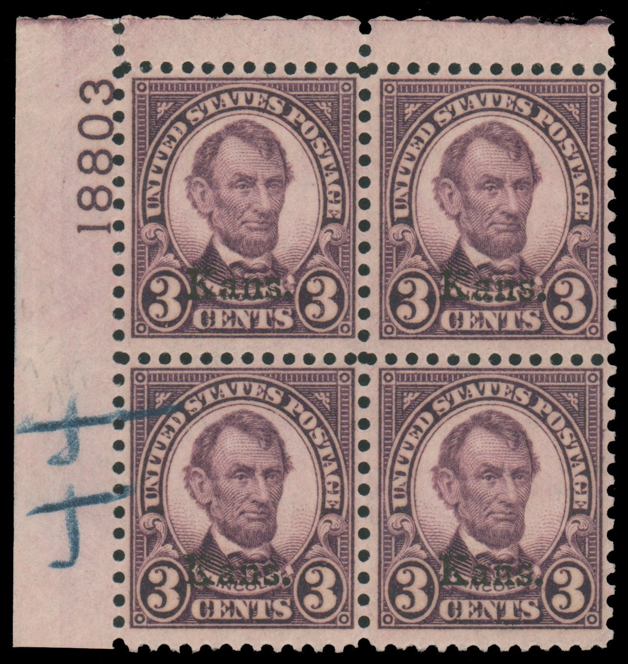 1929, 3c VIOLET "Kans." OVERPRINT TOP LEFT