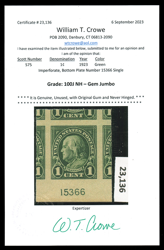 SINGLE NH GEM JUMBO SINGLE GRADED '100J', #575, huge margins, gem jumbo, with 2023 William T. Crowe cert., SMQ $150.00 as grade '100' with no premium for jumbo status (Image)