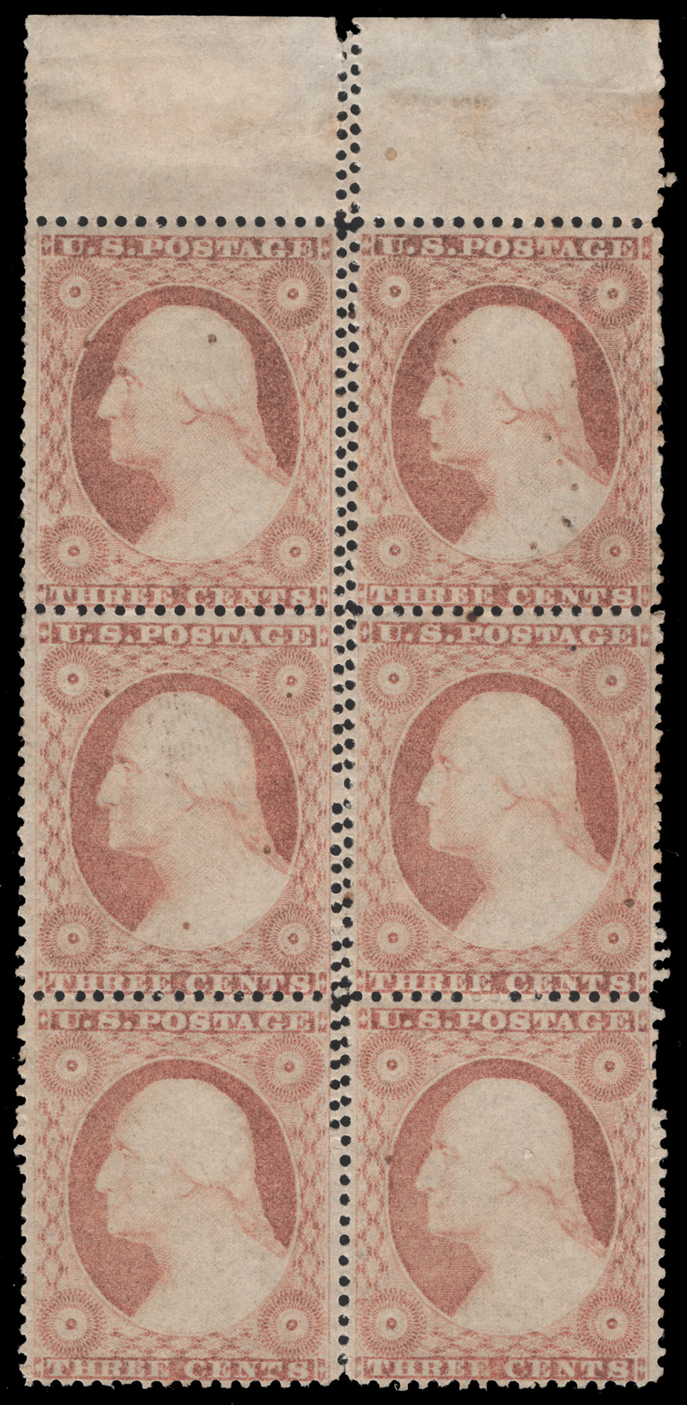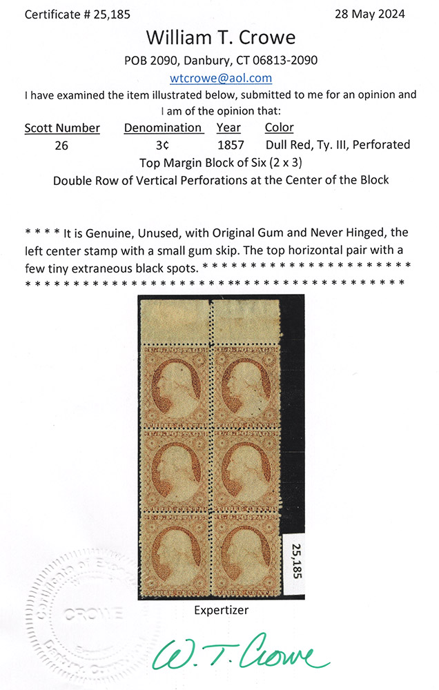 BLOCK OF SIX MINT NEVER HINGED, #26, double row of vertical perfs., fresh, single tiny natural gum skip, top pair with a few microscopic black spots, very fine multple, with 2024 William T. Crowe cert., cat. $600.00 as hinged block and pair (Image) (Scan1) (All Scans)
