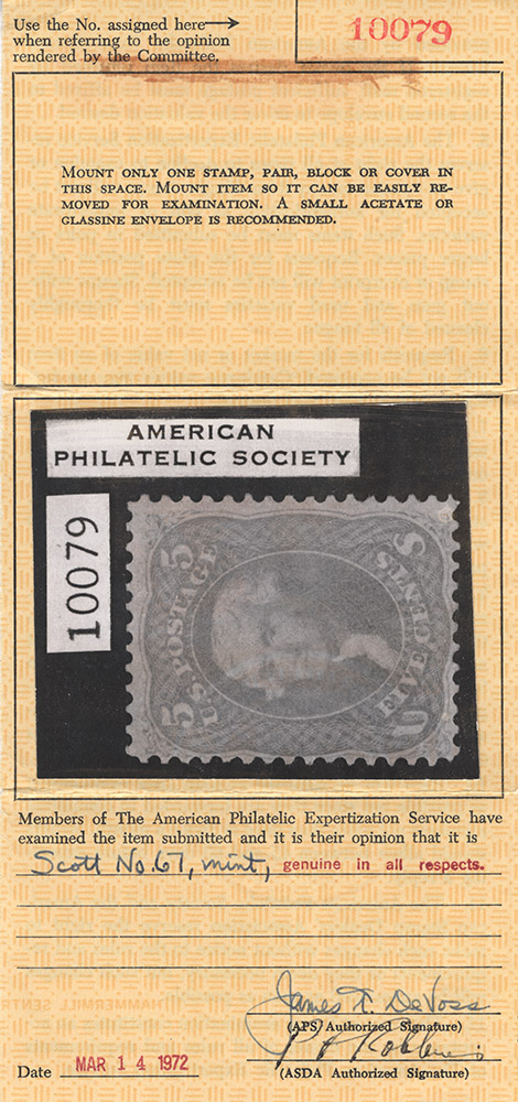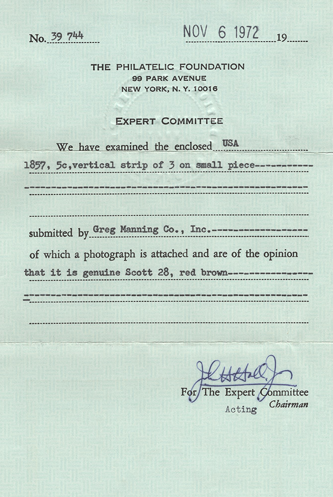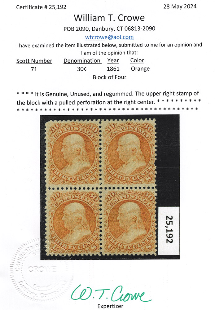 #71, quite well-centered, regummed, top right stamp pulled perf, fine-very fine, with 2024 William T. Crowe cert., cat. $17,000.00 (Image) (Scan1) (All Scans)
