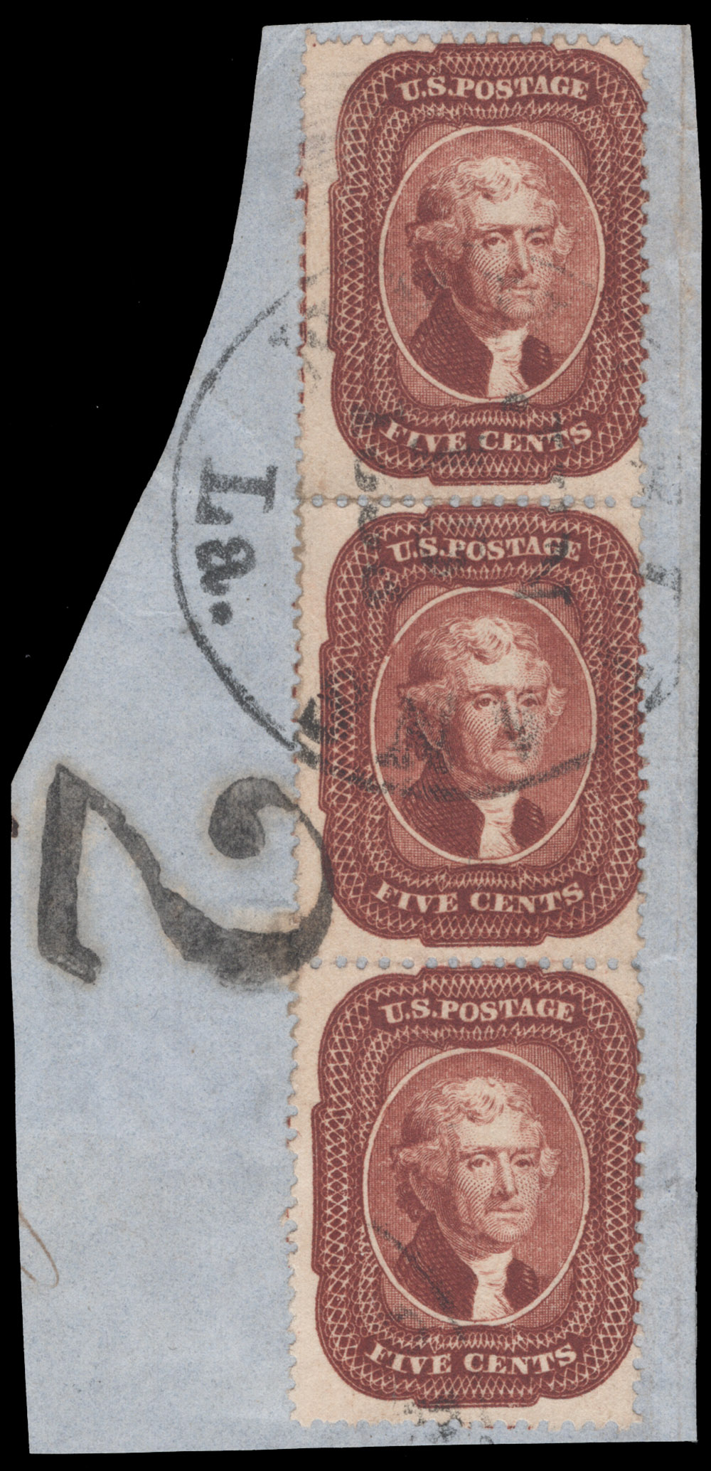 THREE USED ON PIECE, #28, deep red brown shade, tied by New Orleans d.s. and "2" rate marking to the piece, very fine, with 1972 P.F. cert., cat. $4,000.00 (Image) (Scan1) (Scan2) (All Scans)