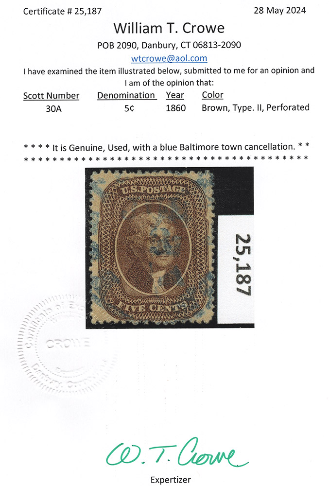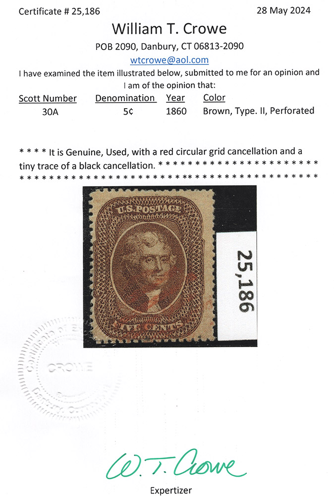 CANCEL, #30A, exceptionally well-centered, extremely fine, with 2024 William T. Crowe cert., cat. $425.00 (Image) (Scan1) (All Scans)