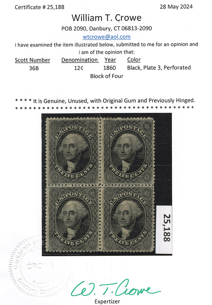 MINT, #36B, intense black shade and impression, full original gum very lightly hinged, well-centered abd very fine, choice multiple from this issue, with 2024 William T. Crowe, cat. $5,000.00 (Image) (Scan1) (All Scans)
