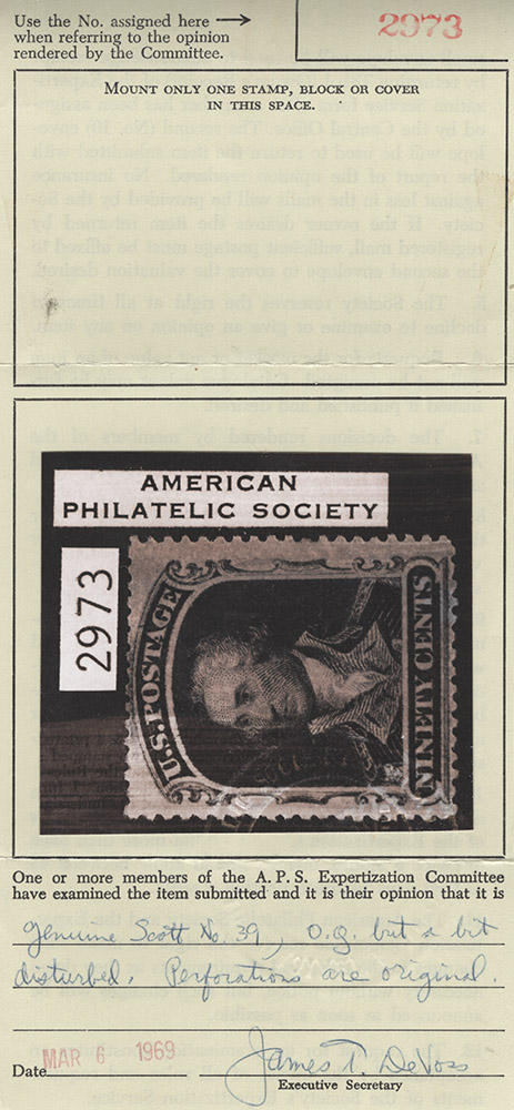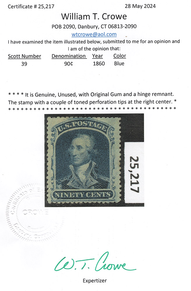 o.g., previously hinged, couple of toned perf tips, extremely fine, 1969 APS and 2024 William T. Crowe certs., cat. $3,000.00 (Image) (Scan1) (Scan2) (All Scans)