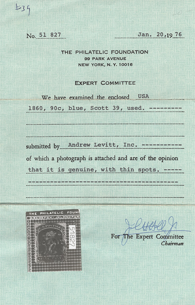 with black grid cancel, small thin spots, very fine, with 1976 P.F. cert., cat. $10,000.00 (Image) (Scan1) (All Scans)