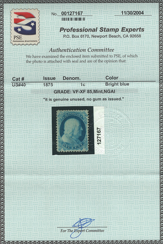 UNUSED, #40 well-centered and fresh, without gum as issued, very fine - extremely fine, with 2004 PSE cert. graded '85' , cat. $600.00 (Image) (Scan1) (All Scans)