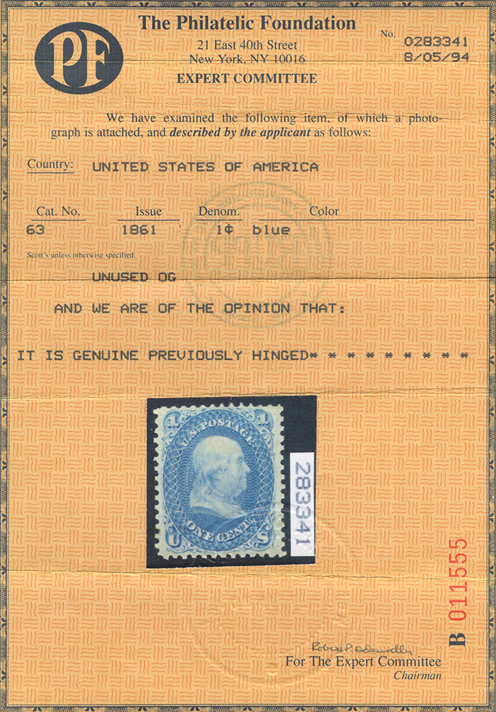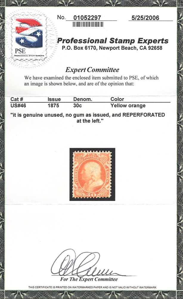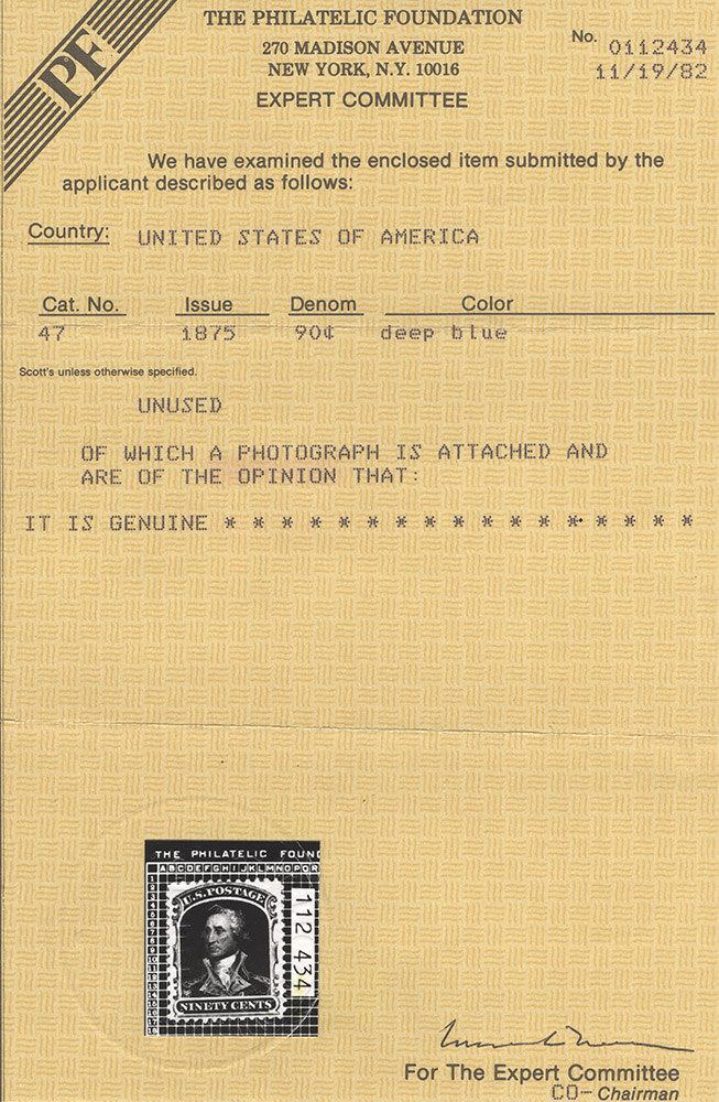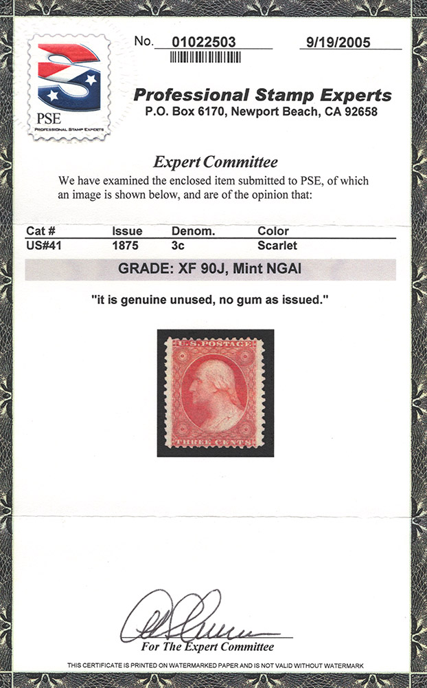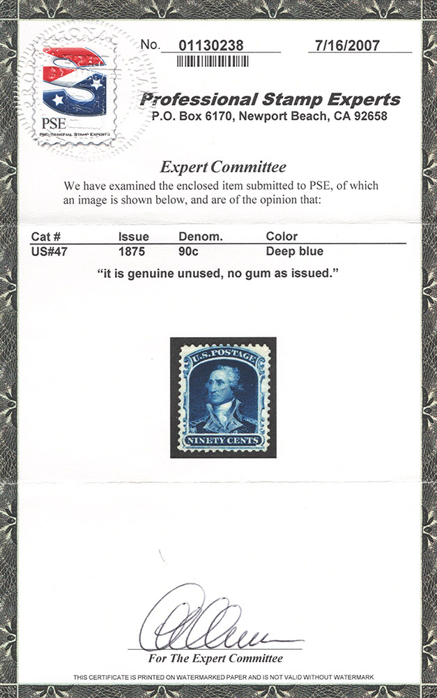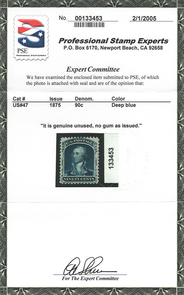 UNUSED, #47, deep impression, well-centered, without gum as issued, choice very fine, with 1982 P.F. and 2005 & 2007 PSE certs., cat. $4,000.00 (Image) (Scan1) (Scan2) (Scan3) (All Scans)
