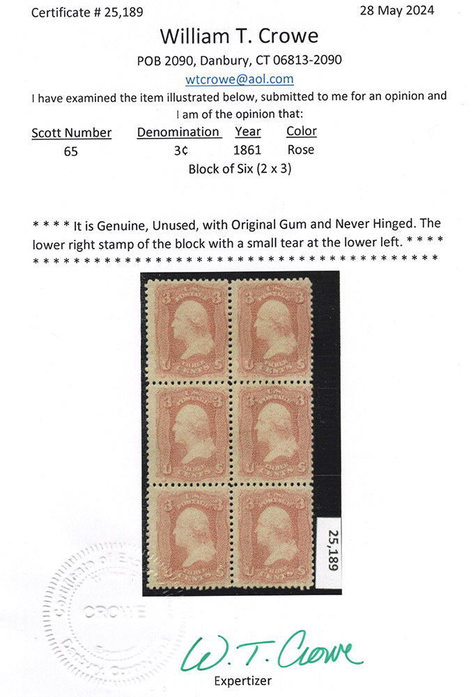 HINGED, #65, fresh, pristine original gum, tiny tear in lower left stamp, fine, with 2024 William T. Crowe cert., cat. $970.00 as hinged block and pair (Image) (Scan1) (All Scans)