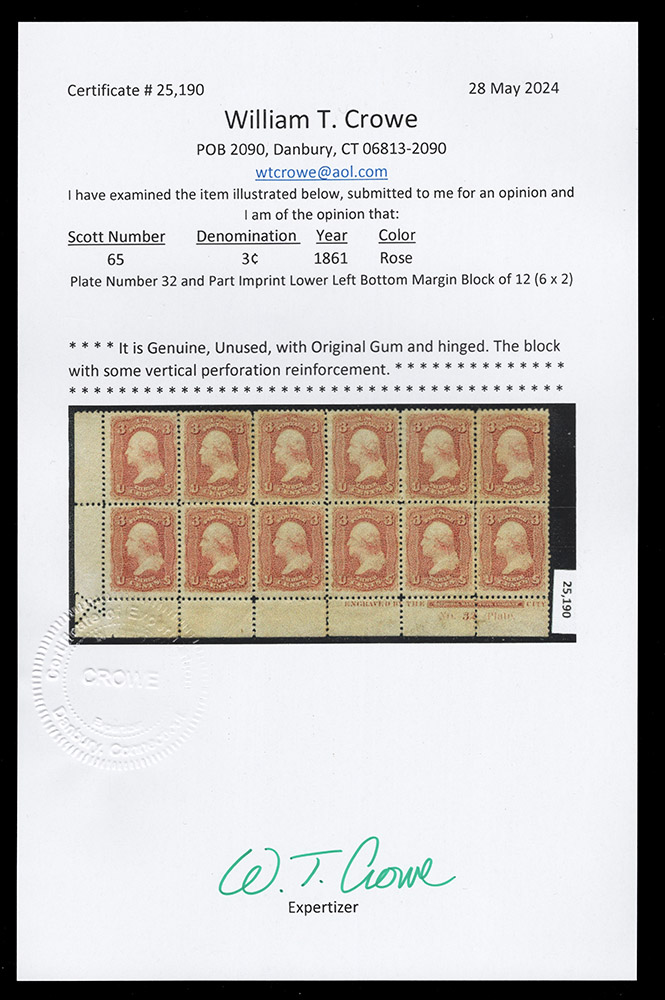 IMPRINT AND PLATE #32 MINT, #65, well-centered and fresh, o.g., previously hinged, few vertical perfs reinforced, very fine - extremely fine, with 2024 William T. Crowe cert., great substitute for the actual plate block, cat. $2,100.00 as three