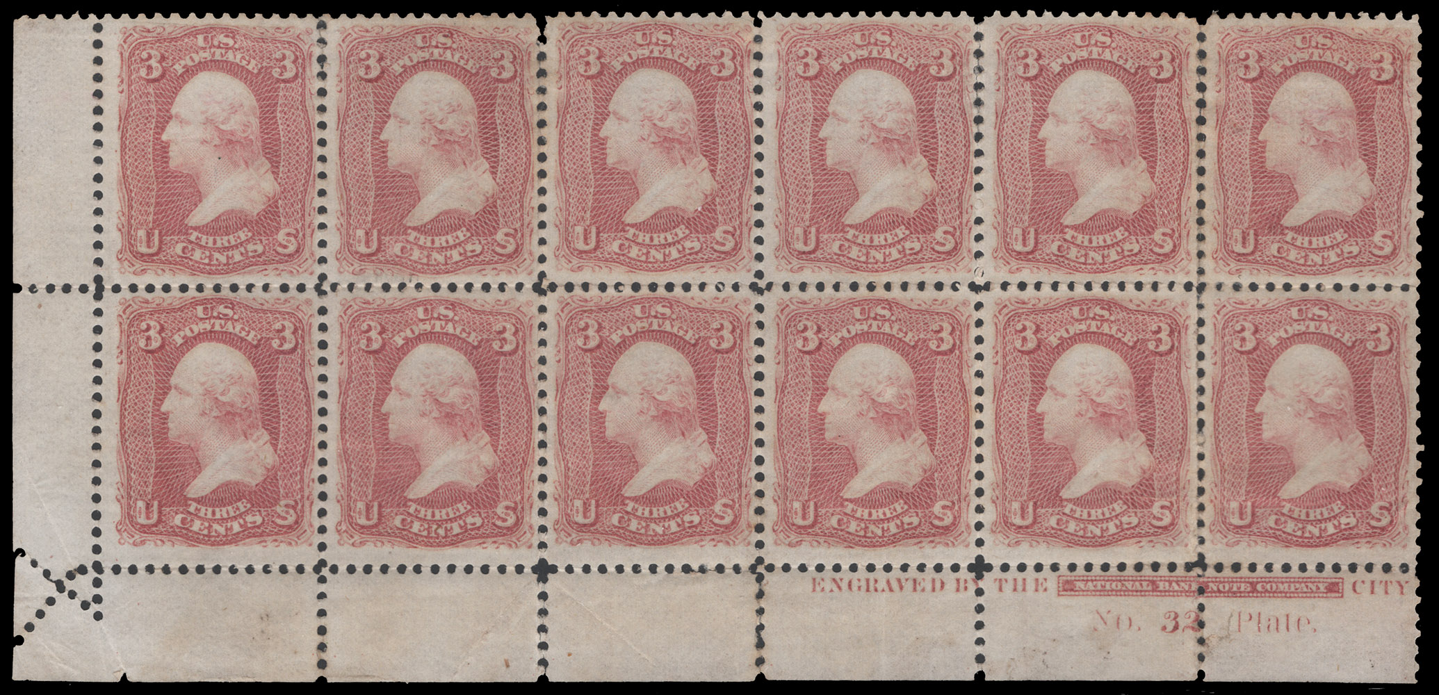 1861, 3c ROSE BLOCK OF TWELVE WITH PART