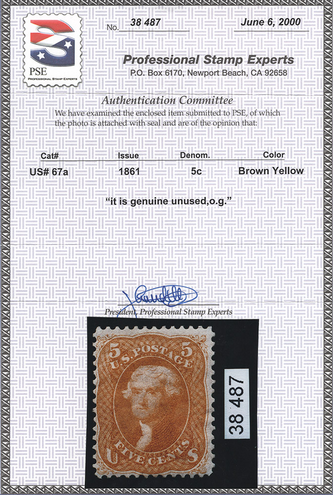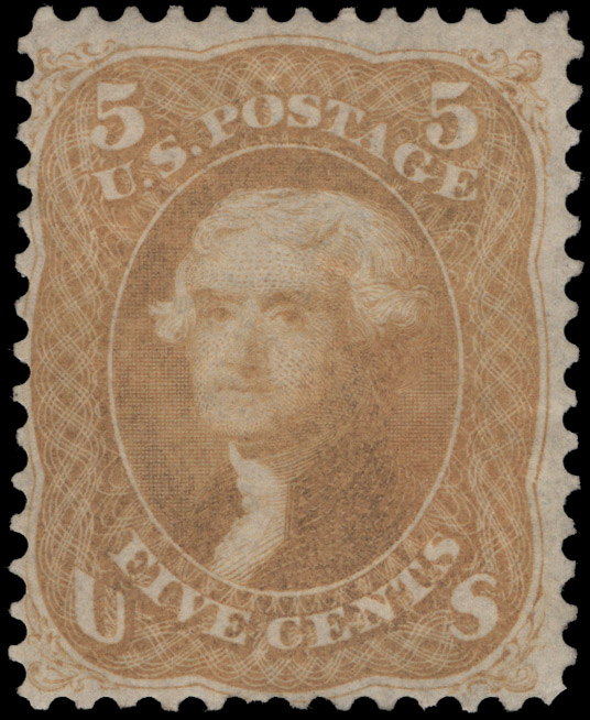 original gum, h.r., great color in the true shade of brown yellow, an exceedingly rare sound original gum examplet of the 5-cent 1861-66 issue in the scarcer brown yellow shade