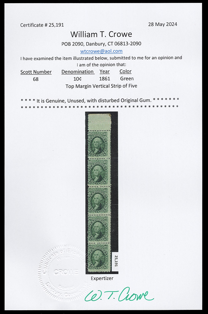 FIVE MINT, #68, fresh, very slightly disturbed gum, fine, with 2024 William T. Crowe cert., cat. $5,150.00 as two pairs and a single (Image) (Scan1) (All Scans)