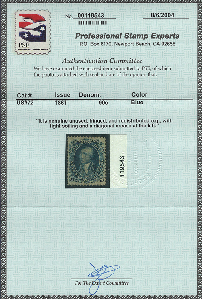 and attractive, redistributed o.g., light diagonal crease, certificate mentions light soiling, very fine, with 2004 PSE cert., cat. $3,000.00 (Image) (Scan1) (All Scans)