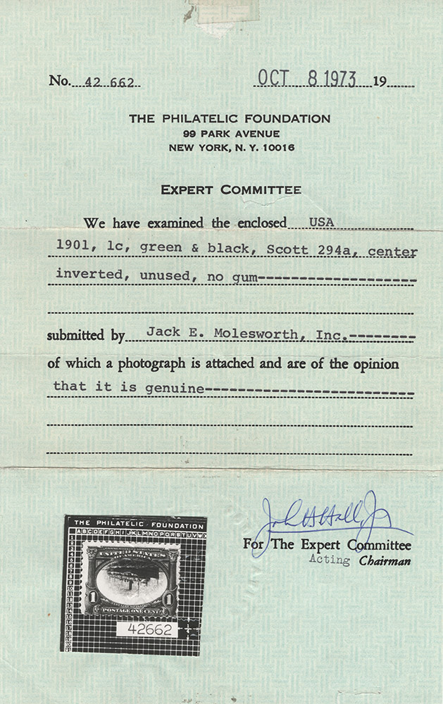 INVERTED - UNUSED, #299a, without gum, thin just around the corner perf in top right corner, almost fine, with 1973 P.F. cert., cat. $12,500.00 (Image) (Scan1) (All Scans)