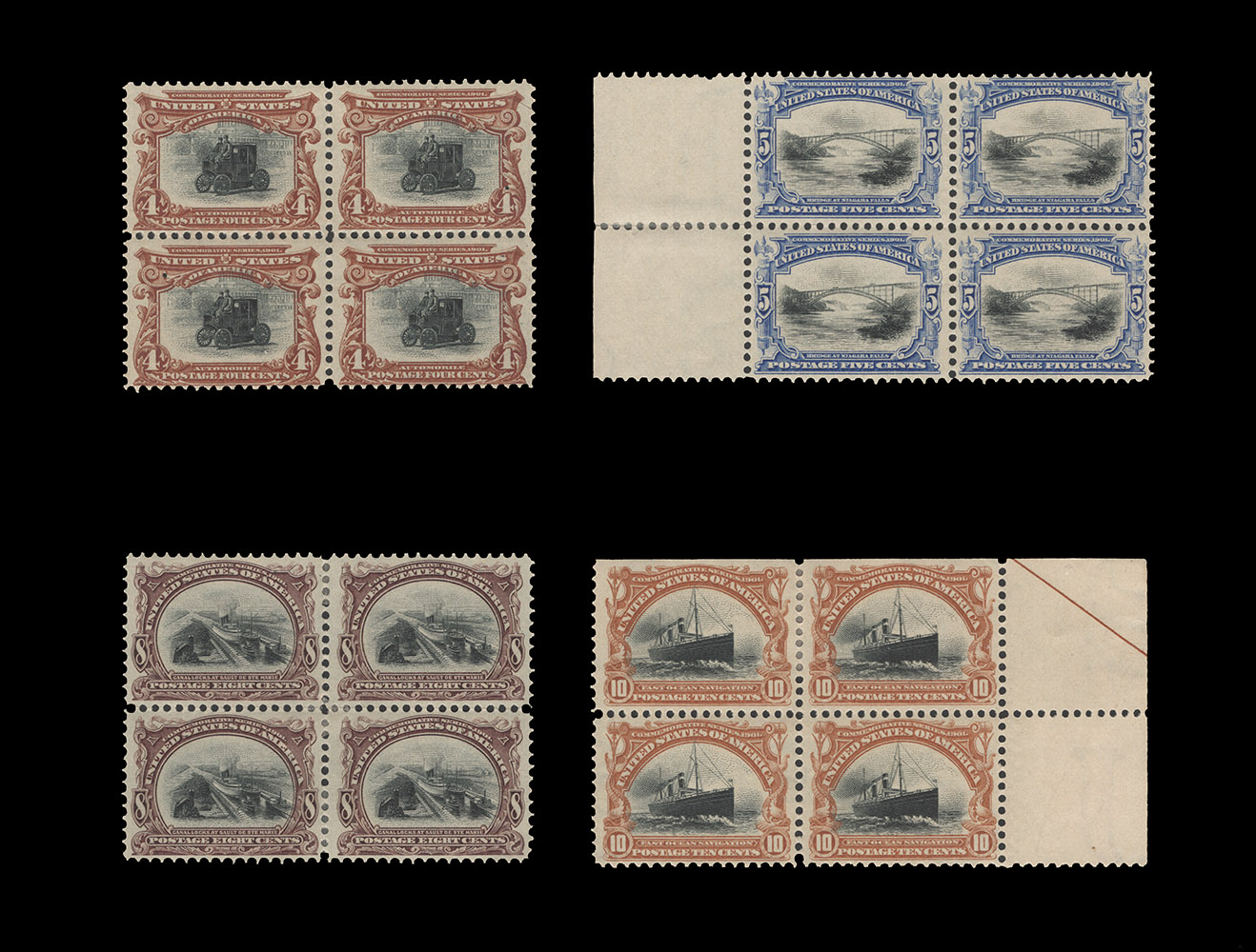 BLOCKS, #296-99, 4c bottom pair never hinged, 5c never hinged, 8c hinged and 10c s.e. at top, bottom pair never hinged, fine-very fine, cat. $2,440.00 (Image) |
