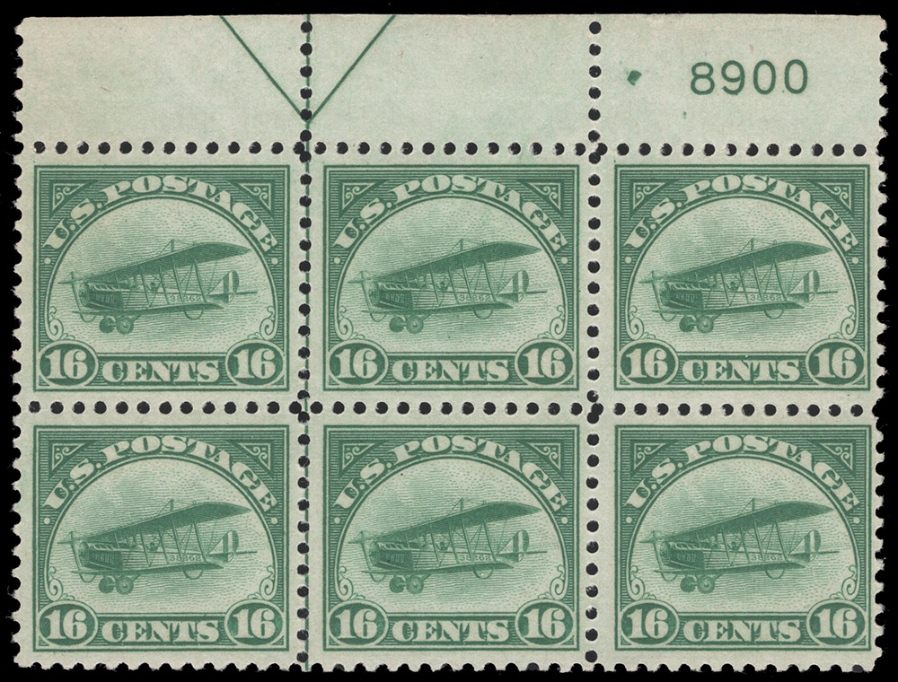 #8900 BLOCK OF SIX MINT, #C2, all stamps mint never hinged, lightly hinged in top selvage, natural gum bends, fine-very fine, cat. $900.00 (Image) |