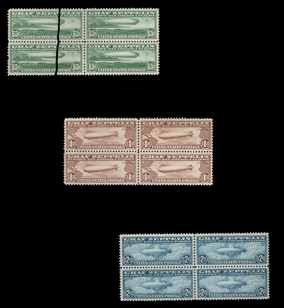 HINGED SET IN BLOCKS OF FOUR, #C13-C15, fresh, and well-centered, at some point the left vertical pair of the 65c block was ripped in half as illustrated, apart from this the set is very fine, cat. $6,700.00 (Image) |
